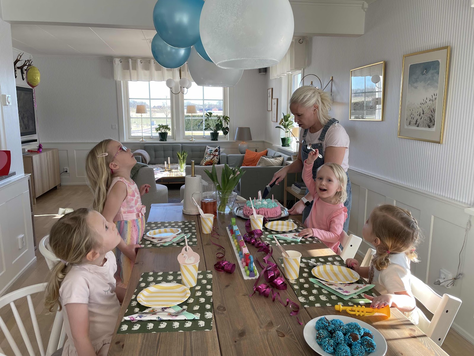 Blå pärlsocker på chokladbollarna och så rosa och blå grädde på tårtan. Tårtbotten blev lite misslyckad för den var inte klar i mitten men då får man inte vara dum så istället blev den ihålig och fylld med maränger vilket uppskattades mycket av de små.